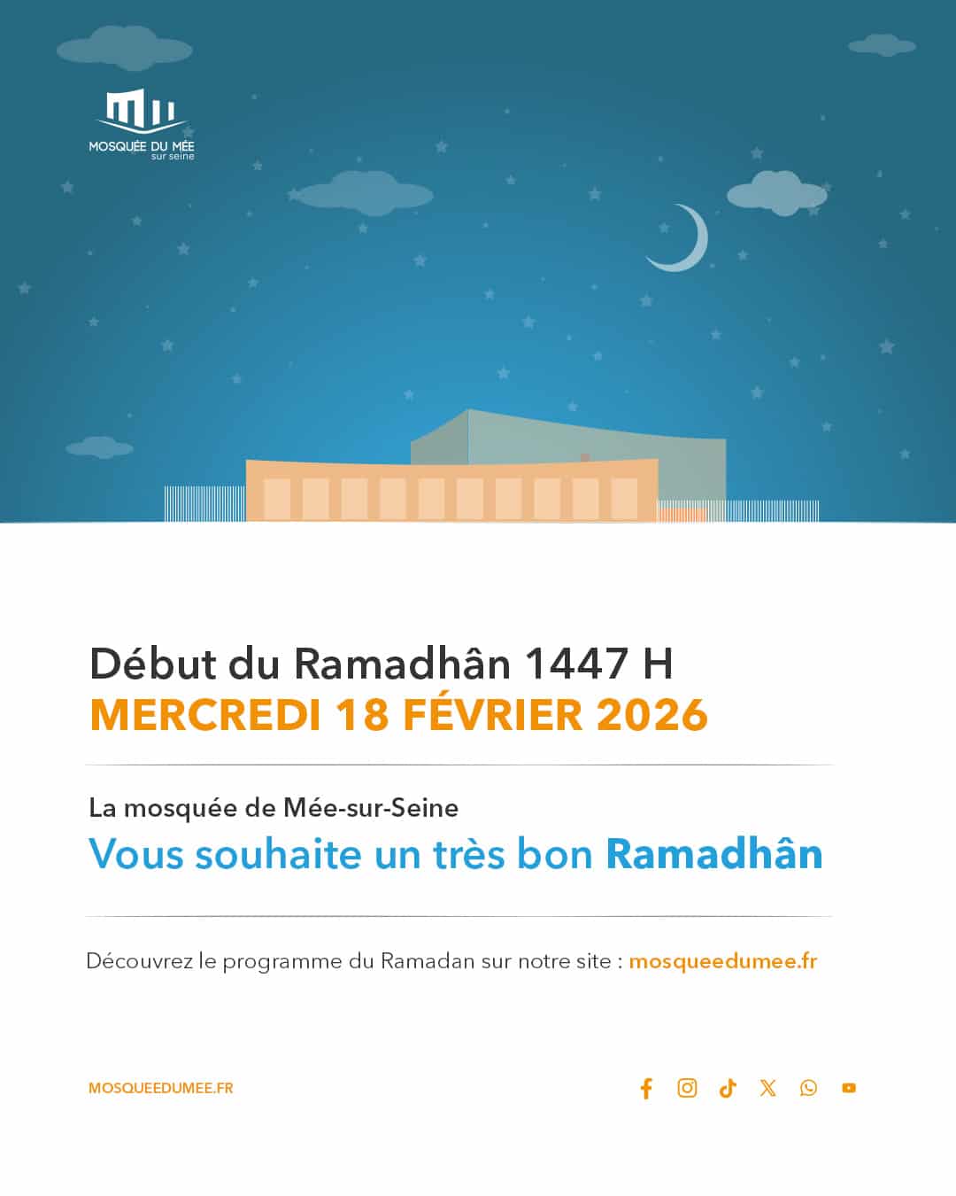 La Mosquée du Mée-sur-Seine a le plaisir d’annoncer que le mois béni de Ramadan 1447 H débutera le mercredi 18 février 2026.